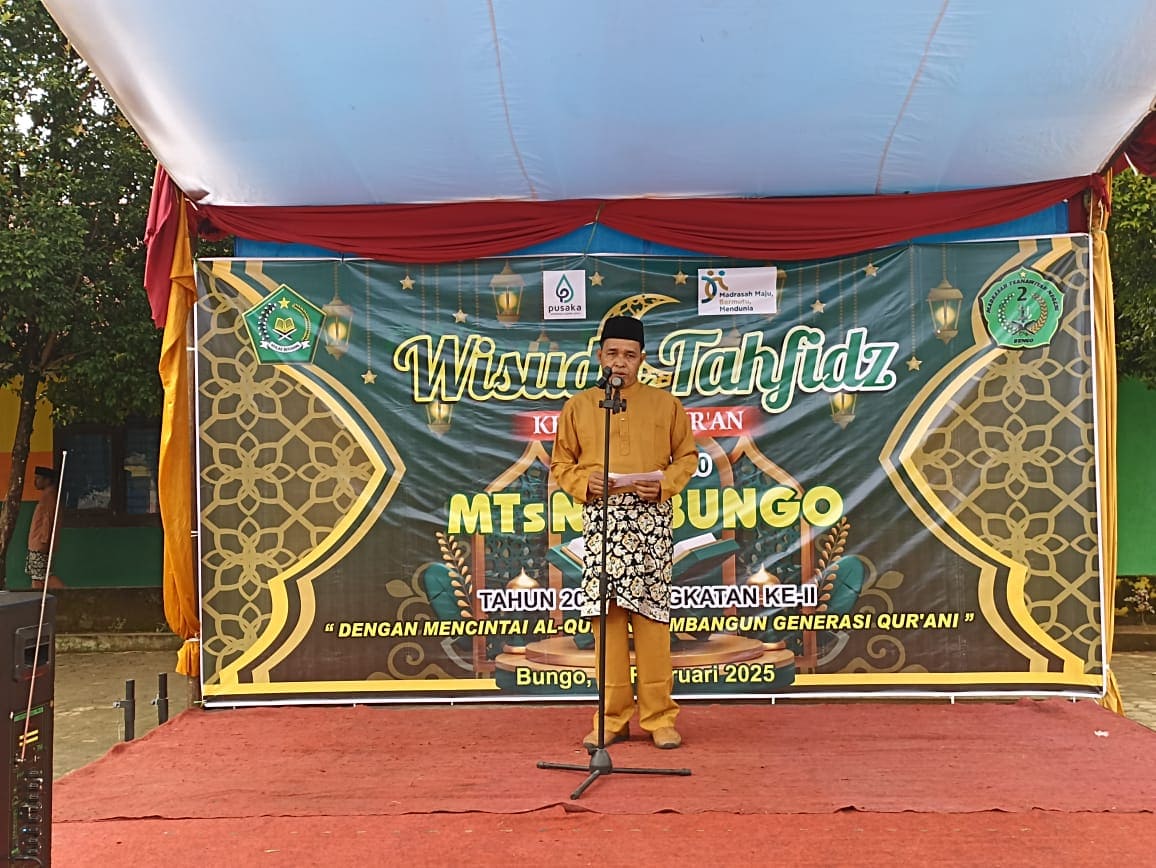 Bapak Drs. Zaharudin, selaku Kepala Madrasah, dalam sambutannya menyampaikan rasa bangga dan syukur atas prestasi yang diraih para siswa/i yang berhasil menyelesaikan hafalan Al-Qur'an dengan baik. "Kami sangat bangga melihat para siswa/i yang telah menunjukkan semangat dan komitmen tinggi dalam menghafal Al-Qur'an. Ini bukan hanya prestasi pribadi, tetapi juga kebanggaan bagi keluarga besar MTsN 2 Bungo," ujar Drs. Zaharudin.