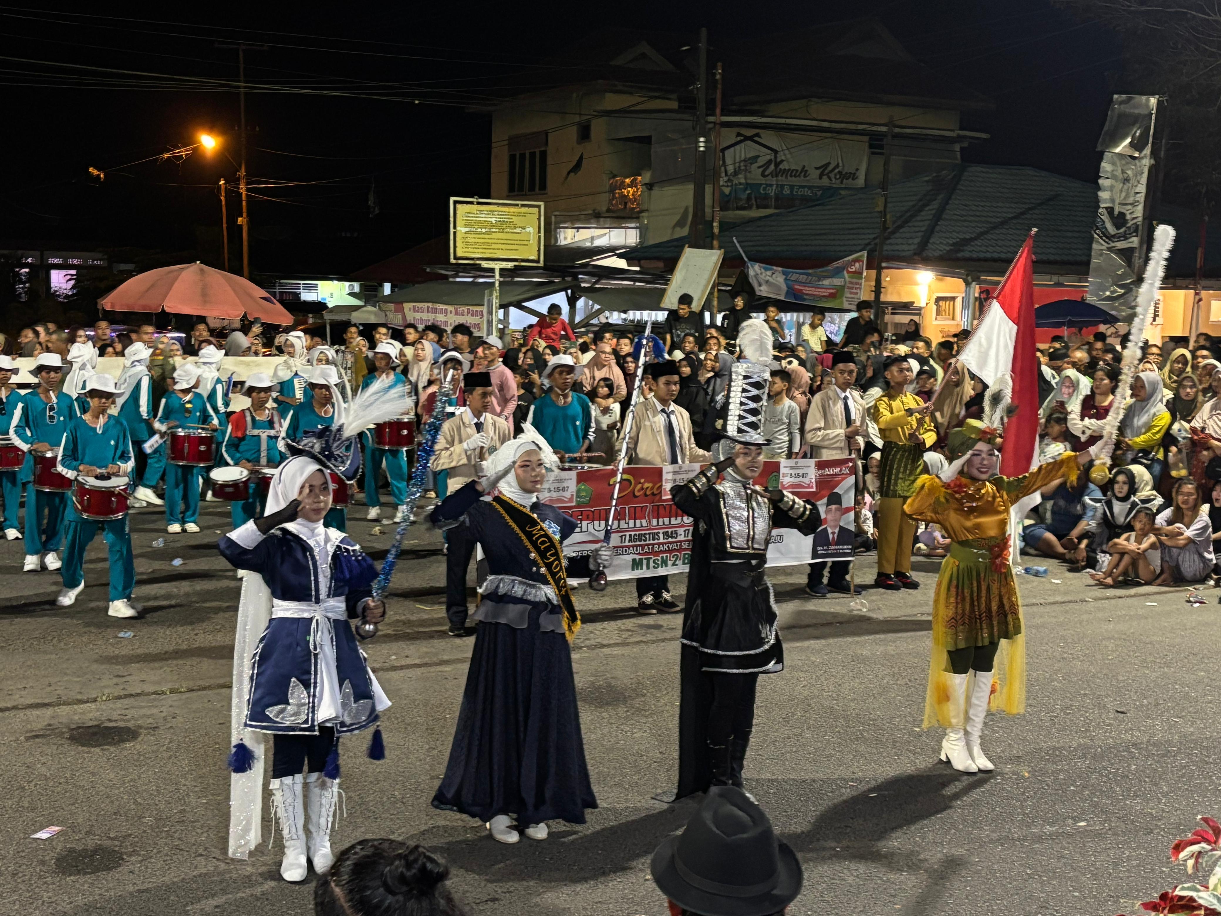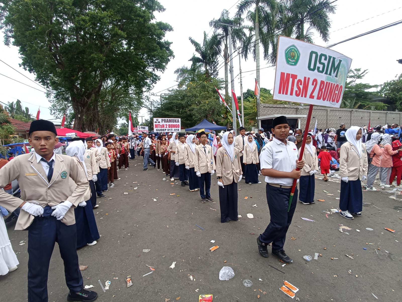 Salah satu peserta yang mencuri perhatian adalah MTsN 2 Bungo, yang tampil mewakili kecamatan Rimbo Tengah dengan urutan kecamatan ke-15 dan urutan pawai ke-7
