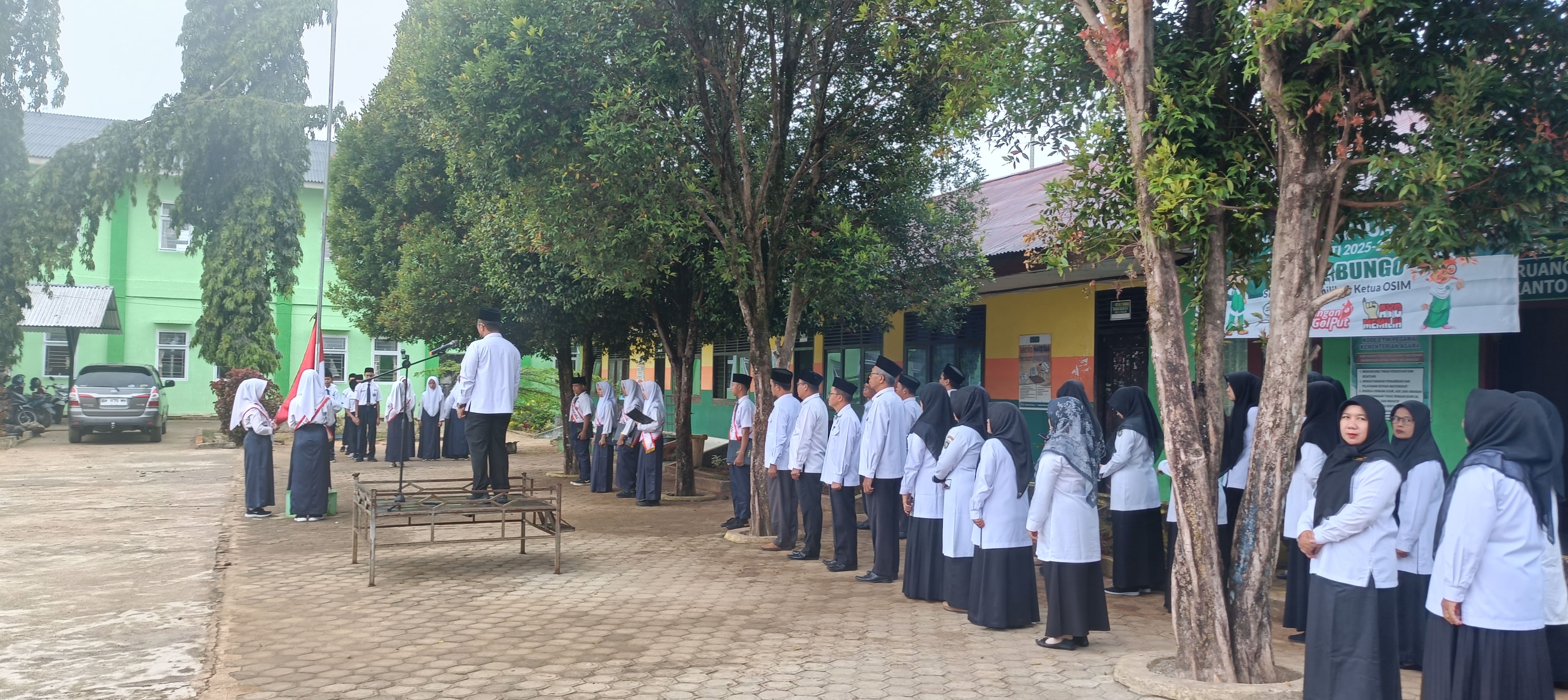 Senin, 25 Agustus 2025 7Meskipun langit pagi ini diselimuti awan mendung, seluruh keluarga besar MTsN 2 BUNGO tetap melaksanakan upacara bendera dengan penuh khidmat di lapangan madrasah.