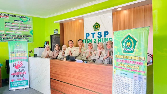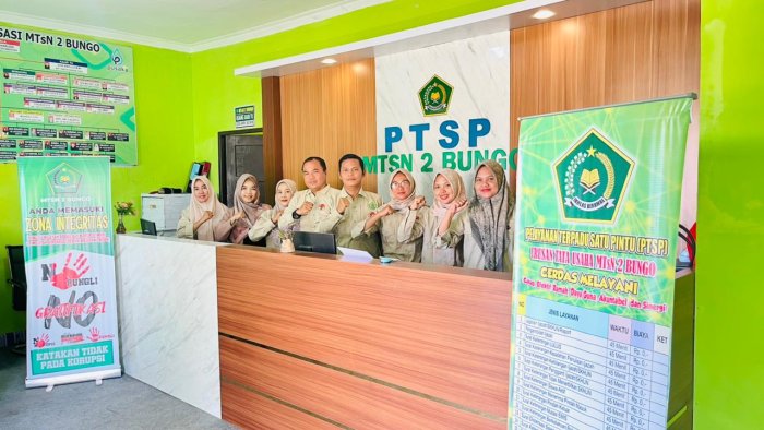 Sementara itu, Kepala Tata Usaha MTsN 2 Bungo, Izon Amri, S.E., MM, menegaskan bahwa PTSP menjadi ujung tombak layanan publik di madrasah. “PTSP hadir untuk memangkas birokrasi berbelit dan memberikan kepastian layanan yang efektif serta ramah bagi siswa, guru, dan masyarakat. Kami terus berupaya menjaga kepercayaan dengan prinsip transparansi dan akuntabilitas,” jelasnya.