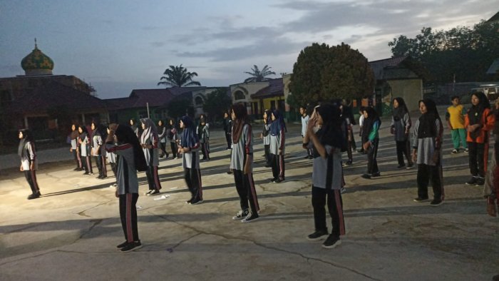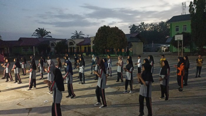 Bungo, Minggu 14 September 2025 — Para anggota Palang Merah Remaja (PMR) MTsN 2 Bungo menunjukkan semangat tinggi dalam mengikuti kegiatan senam sehat yang diadakan di lapangan madrasah setelah salat subuh berjamaah. Meskipun suasana pagi masih gelap dan udara cukup dingin, antusiasme para peserta tidak berkurang.