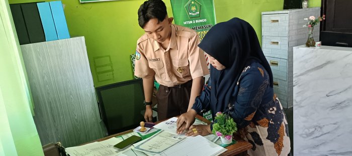 Bungo, Kamis, 18 September 2025 – Madrasah Tsanawiyah Negeri (MTsN) 2 Bungo hari ini menyelenggarakan kegiatan pengambilan ijazah bagi para siswa lulusan tahun pelajaran 2024/2025. Proses pengambilan ijazah dilaksanakan di ruang Staf Tata Usaha (TU) dan dimulai sejak pukul 08.00 WIB.
