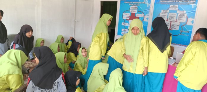 Bungo, Jumat, 10 Oktober 2025 — Anggota Palang Merah Remaja (PMR) MTsN 2 Bungo melaksanakan kegiatan pemantapan program kerja di ruang PMR madrasah. Kegiatan ini bertujuan untuk memperkuat peran organisasi serta meninjau dan memperjelas pelaksanaan setiap program yang telah dirancang oleh masing-masing unit PMR.