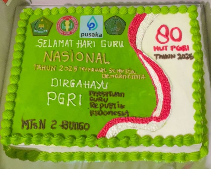 Kue peringatan tersebut dipersiapkan oleh seluruh guru sebagai simbol rasa syukur, kekompakan, serta penghargaan atas dedikasi para pendidik dalam mencerdaskan generasi bangsa. Dalam prosesi pemotongan kue, Kepala Madrasah didampingi oleh Kepala Urusan Tata Usaha MTsN 2 Bungo serta beberapa guru senior, yang menambah hangat suasana perayaan.