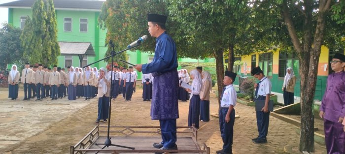 Bertindak sebagai **pembina upacara**, Kepala MTsN 2 Bungo, **Drs. H. Zaharudin**, menyampaikan amanat yang menekankan pentingnya menumbuhkan rasa cinta daerah, semangat persatuan, serta peran generasi muda dalam mendukung pembangunan Provinsi Jambi ke arah yang lebih maju.
