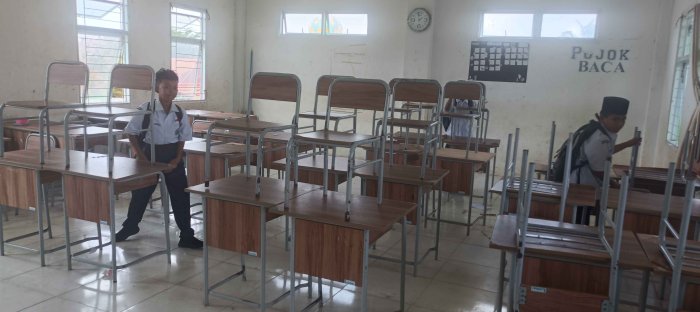 Terlihat adanya kerja sama yang baik antar siswa. Siswa laki-laki dengan sigap membantu mengangkat dan menata kursi, sehingga memudahkan siswa perempuan dalam menyapu dan membersihkan ruang kelas. Kebersamaan dan saling membantu ini mencerminkan sikap gotong royong serta kepedulian antar sesama.