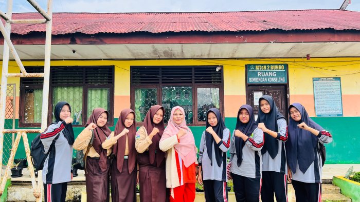 BUNGO, 20 Maret 2026 Keluarga besar Palang Merah Remaja (PMR) MTsN 2 Bungo menunjukkan kekompakan dan kehangatan mereka dalam menyambut hari kemenangan. Melalui sebuah sesi dokumentasi yang dilakukan di depan ruang Bimbingan Konseling (BK), para anggota PMR bersama guru pembimbing tampak berseri dalam balutan seragam kebanggaan mereka.